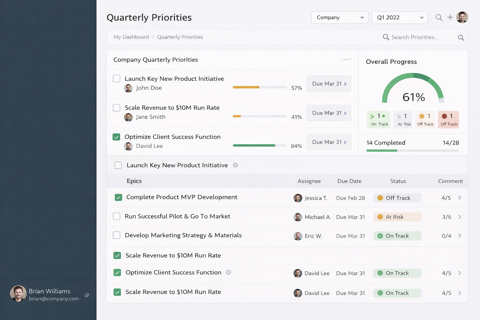 Strategy doesn’t fail from lack of ideas — it fails when follow-through is inconsistent and communication is inefficient. We establish a consistent operating cadence that drives execution, connects priorities to weekly commitments, and surfaces issues early while there’s still time to course-correct.